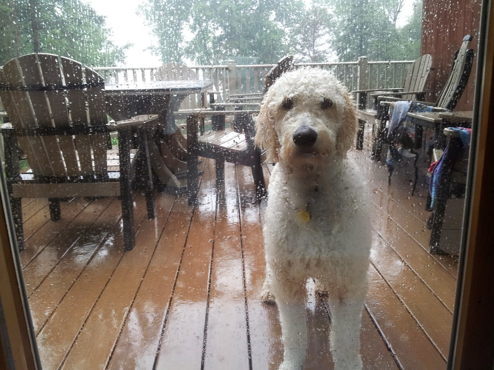 | Naughty AND wet goldendoodle since he had just taken a dip in the lake! |