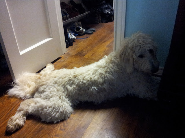 I haven't had much time in the past to blog until now. Spuds is our new 14 half week old F2 Mini Golden Doodle. Thanks to Doodle Kisses and the internet I am trying to train him early in his life. Today, I have learned that he is the Alpha dog and I am a peon in his pack. LOL. Funny but true. He cries in his crate, I comfort him. He will not eat on his own, I hand feed him. Get the picture. Well today is a new day.