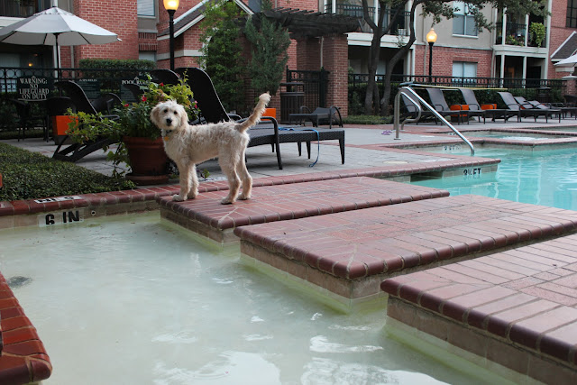 Some days the Milt likes to join me at the pool. Are dogs allowed in the pool? That's a loaded question. During apartment office hours, no, definitely not. After apartment office hours, well it's a toss up.
