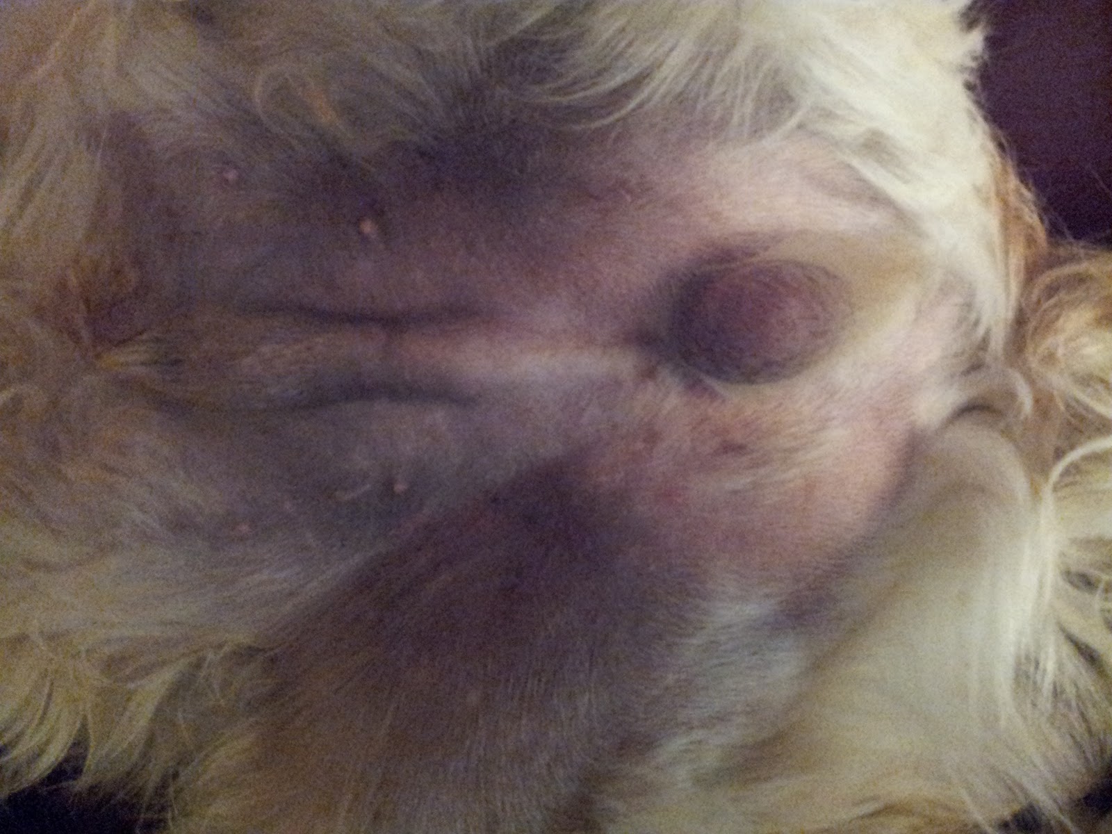 Almost all male testicles have dropped by 6 - 8 weeks of age but not our boy's. This condition is known as cryptorchidism - "hidden flower." In normal development, the testicles form in the abdomen and then travel down a canal to their final resting place in the scrotum. Our boys' pair did not follow that routine path. Instead, Milton's other testicle could be floating around anywhere along that route. Who knows? The main worry is a condition like this can easily develop into testicular cancer or torsion, so the testicle must certainly be found and removed.