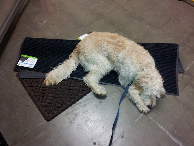 Rather than weekly dinners out at fun restaurants, our life has become weekly, bi-weekly, and even tri-weekly trips to Lowe's and Home Depot to buy all those "fun" supplies for the home. Both of these stores, due to their hardware nature, allow dogs inside, so the Milt is a good tag-along. If I need to make one of these trips, I always time it for a day that the Milt has stayed home, so he can come along for the ride and keep his Momma company.