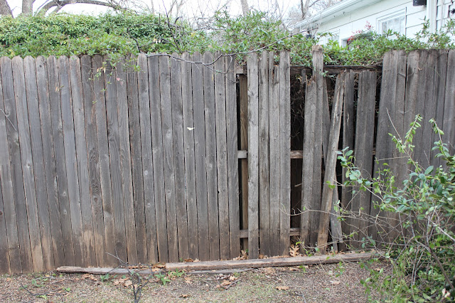 Another big ticket fix-it item is our fence. It has multiple gaps and holes that we think Milt is a little too big to squeeze through, but with the proper motivation, anything is possible. Actually, in the area shown below, our doodle can navigate the tiny crawl space between our dilapidated fence and our neighbor's to run the gauntlet up and down pretty far back. Now that's a problem right there.