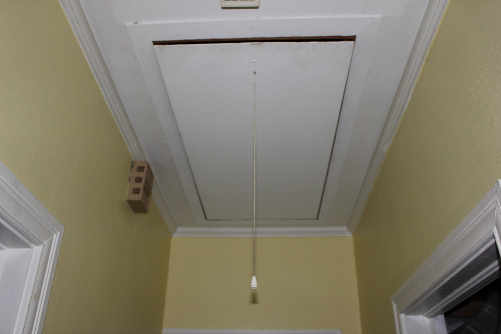 That is our pull-down staircase entrance to the attic that is absolutely not flush with the ceiling. I have declined to enter the attic because Jeff has sighted multiple cockroaches (two to be exact!) up there. I have spied a rather large one (I bludgeoned it to death again and again and again) just under this pull-down apparatus, so I am quite confident that cockroaches can fly down from above. This is a top priority for me but a low one for Jeff. Growing up in Louisiana, Jeff is a lot less squeamish than I am at the sight of the nasty, little buggers.