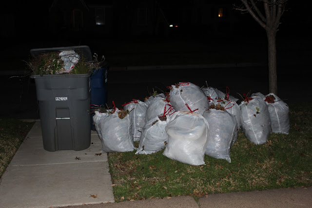 One thing that we did get accomplished this weekend was an awful lot of raking. We have a giant pecan tree in our backyard that sheds a boatload of leaves. I suppose these leaves were shed back in November, but we have a lot of other things to do around here! Sunday night we piled all of our 15 or so bags down by the curb for pickup. When I arrived home from school that afternoon, they were still all piled there. I guess our sanitation workers only take what is in our garbage bins. It was not quite as rewarding hauling all of those full bags back to the backyard, to wait for "Bulk" Pick-Up Day, as it was hauling them down to the street...