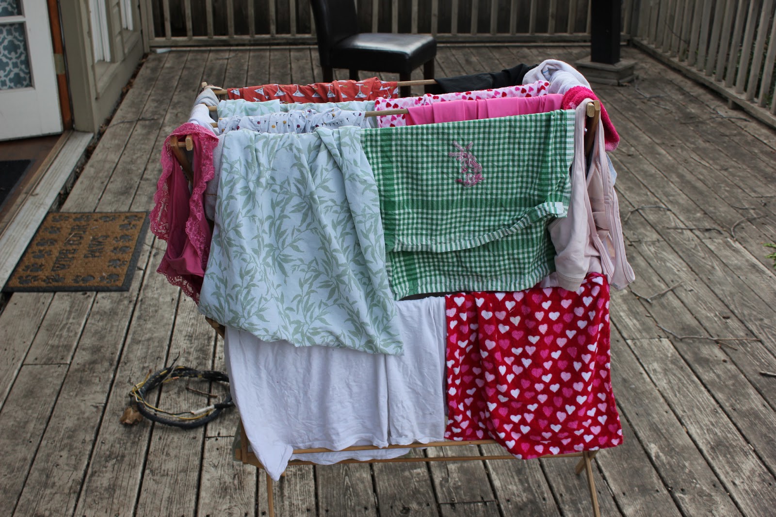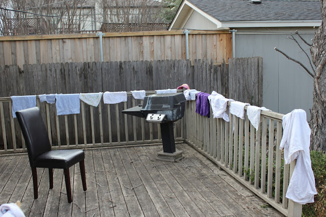 Why ever am I drying all of my clothes outside, you might ask, especially since Pop spent 20+ hours enlarging our wash room last weekend? Well, after all that hard work, our dryer has ceased to work. It up and died on me Friday night just when I needed it to dry a whole heap of clothes. How did this tragedy occur? We believe the dryer was broken in transit during our move, and I still hold out hope that it is a voltage problem that we can look further into this upcoming weekend. Until then, we are letting it all hang out, all over our porch. Trashy, I know. At least it's not our front porch.