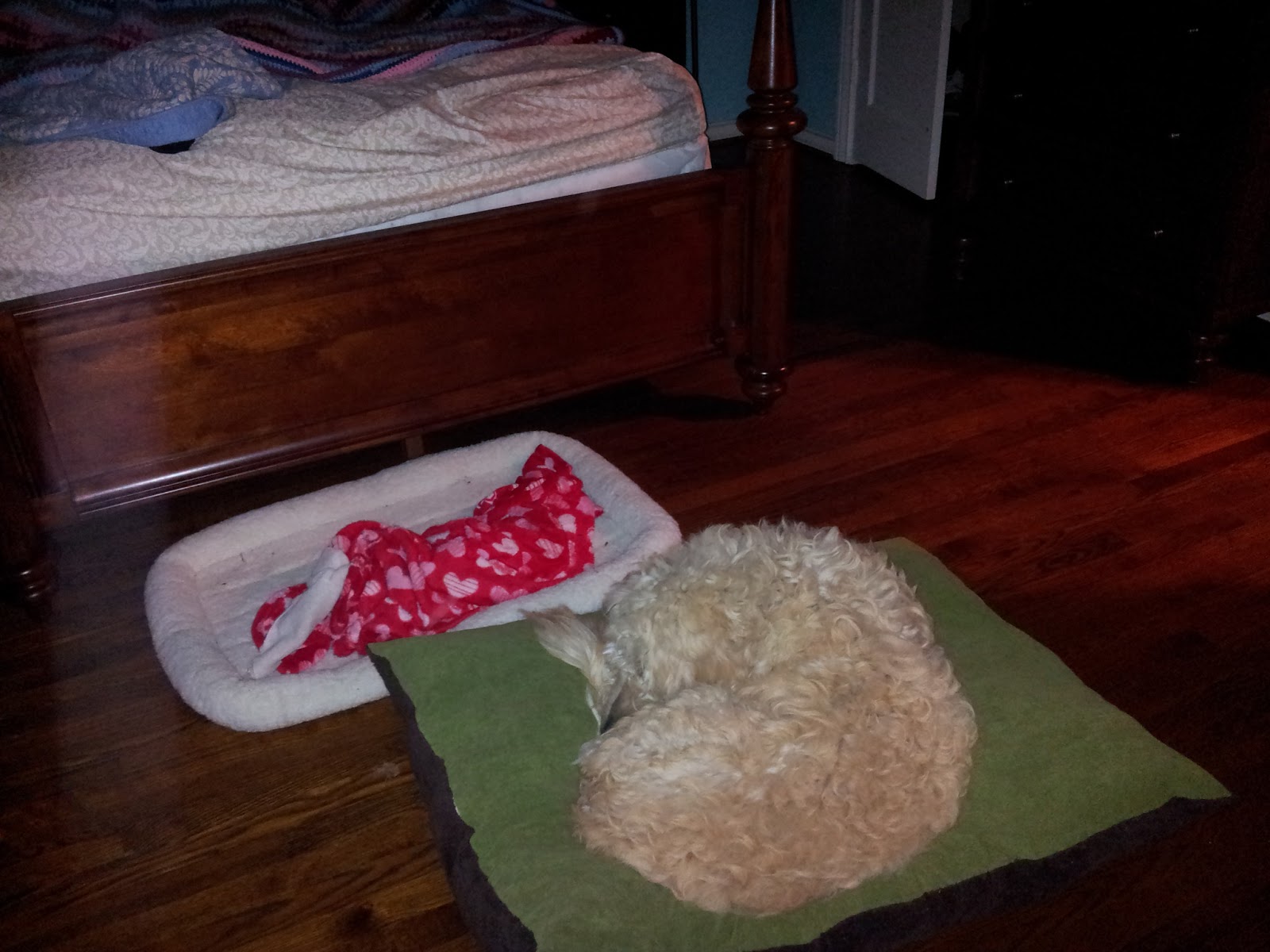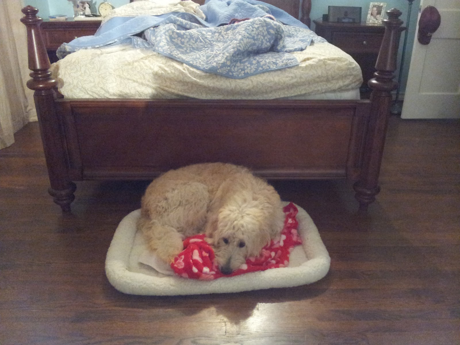 So far, Milt is unphased by all the new furniture, as could be expected. I think he does find it interesting that Jeff and I now sleep so much higher off the ground and away from him! Last night, he was resting his head on the bed looking lovingly up at us. Taking that crate away makes me hope that Milt does not suddenly take another interest in nighttime chewing, on our new bed...! Jeff thinks we would wake up and hear him, but I am not so certain. So far, so good though!