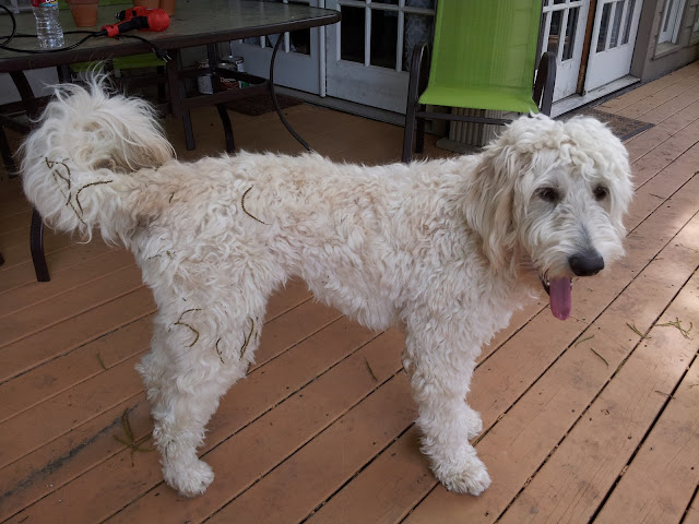 All of the debris that our tree drops just gets picked right back up again by the Milt dog's fur and tail.