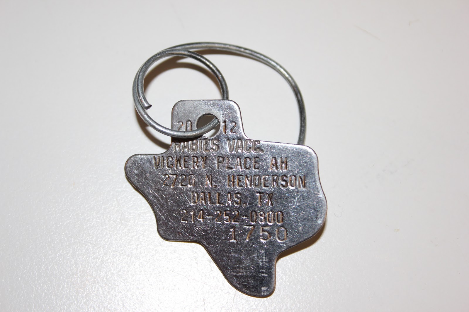2. Rabies tag - All dogs are required to wear their rabies tag that tells where they were vaccinated and the year. While navigating the streets, I have never been stopped by a police officer demanding to see our dog's tags but better safe than sorry. Milt's tag is in the shape of Texas because as I have learned, Texans love their state an awful lot.