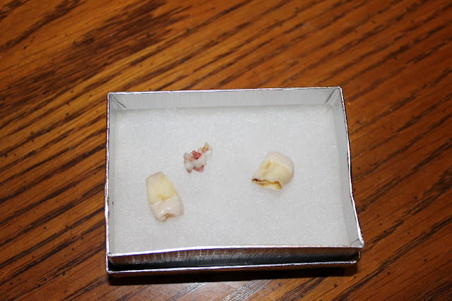 Jeff thinks it is super odd, not to mention disgusting, that I am secretly hoarding my wisdom teeth away in a deep, dark closet. It seems pretty normal to me, especially since my dad was the one who pulled them. They're relics. Since Milton's tooth is a keeper too, we might have to take a by on the Tooth Fairy, and just tuck all three of these away until another opportune moment arises to showcase them once again!
