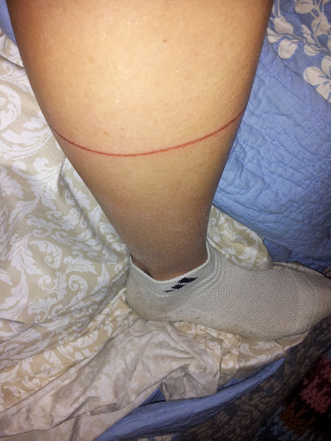 What is the "Buyer Beware!" bit of this post all about? Well, in addition to being sick, with what I think was a 24-hour flu bug or a reaction to the triple-washed salad that I deemed safe not to wash again but maybe I should have, I was injured at the dog park! On Monday, Milt and I went for a post-work trip, and I completely blanked that the park is always closed on Mondays. Thankfully though, the water portion was still available, so we went over for Milt to have a dip. Lots of other dogs were there, but one woman arrived with her new schnoodle puppy. She was black/white and super cute, but the woman kept her on the leash because she was uncertain how the pup would interact with the big dogs. This leash was a retractable, but instead of like a nylon material, it was made out of wire to prevent puppies chewing. Well, that puppy ran around and got tangled around my leg. The woman said a terse, "Sorry," but I reached down to grab at my shin. You might think, how bad could that possibly hurt, well look: