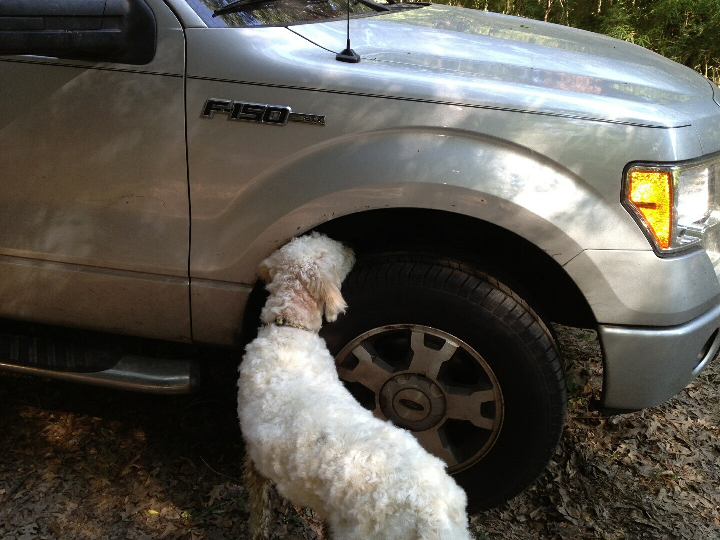 For Milton, our countless walks throughout the neighborhood are more like hunting exhibitions. He delights in yapping at clusters of birds as they up and fly away. Squirrels, also known as tree rats, are favorites to dash after in fast pursuit. As one can imagine, I am always the bothersome tag-a-long who never moves quite quickly enough for Milt to seal the deal and grab his prey. He probably thinks if I wasn't always holding him back, he would be fully able to feed our little family of three. I happen to disagree, but then again I am the one who constantly gets my arm yanked out of socket as he lunges to consume. Has the Milt Dog ever succeeded in luring, trapping, and catching a rodent? Well, no, but recently he did "tree" something new while at the land with Pop.
