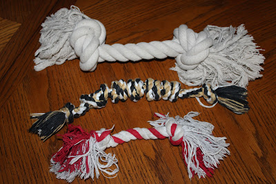 "Red rope" was the first toy introduced to the Milt. Jeff and I think that if we name everything then Milton will come to recognize his toys more easily. After red rope, we bought Milton the New Orleans Saints rope (Jeff's homestate pride), and finally we purchased the massive boat rope. Milt enjoys a good game of tug of war on a daily basis.