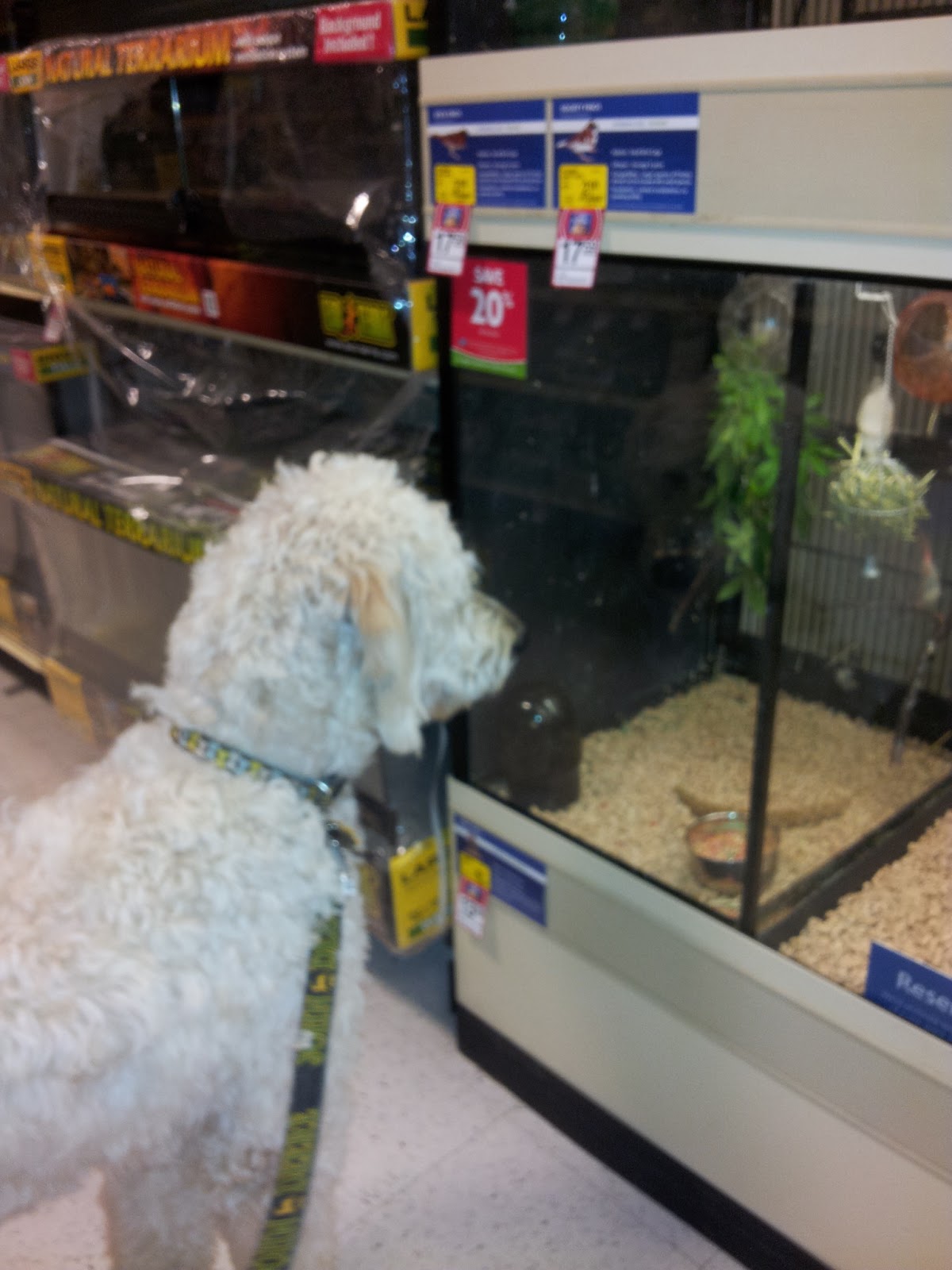 For a dog like Milton, who desperately wants to nab a bird but, sadly, has never been successful, he was utterly and completely entranced. It was a private hunting ground just for him as he silently and stealthily observed the birds dart about in their sanctuary. After quite some time of deep stares and jumps to get a closer look, I thought it best to relocate to another section of the store. I could only imagine Milton's 62-pounds breaking the glass and birds flooding everywhere. I wasn't in the mood to pay out, just so he could finally have a victory.
