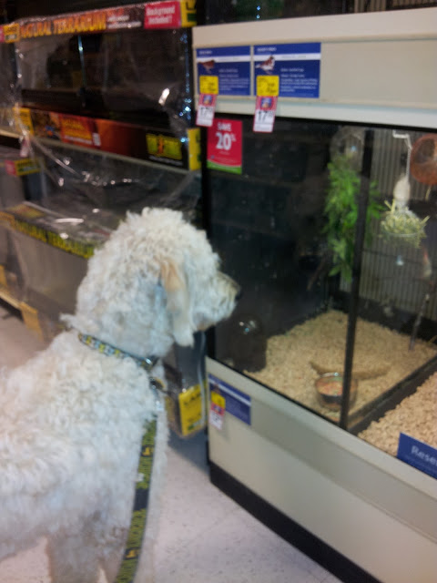 Cute Milt! Sadie is always entranced by the birds at PetSmart. But the last time we were there she was completely focused on a turtle that was minding its own business and swimming around its tank. She did her "what the heck is that?" growl and even smacked the glass once with her paw. I don't think she'd ever seen a turtle before.