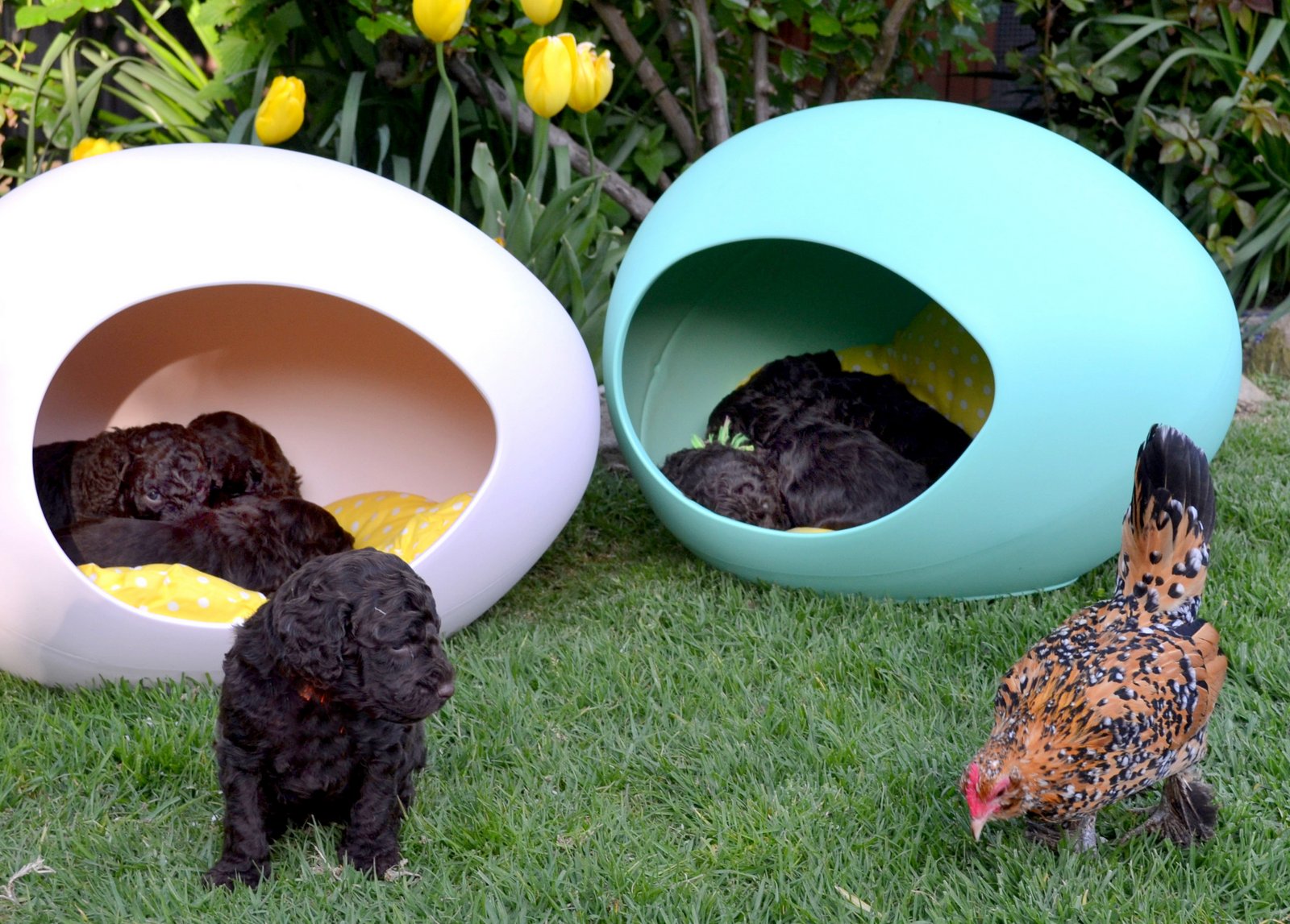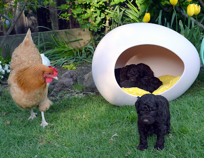 Fergie's ("Country High Fashion") four-week old puppies foray out into the garden and meet some new friends...