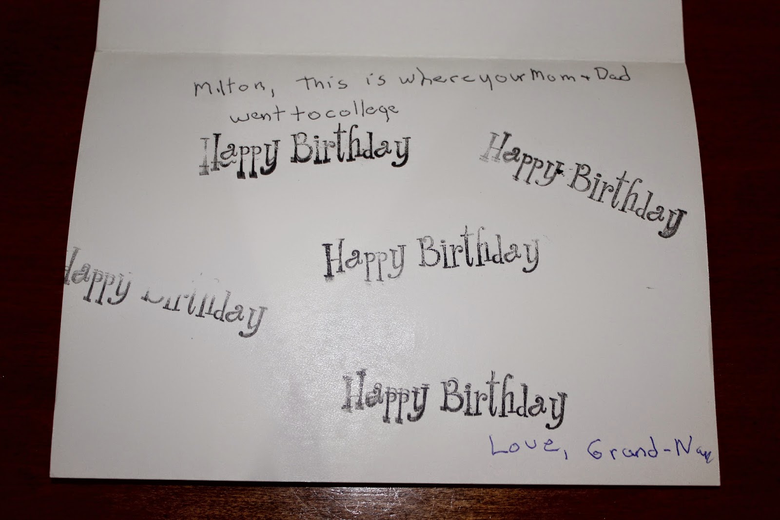 Okay, well, this is a biiiiiit of a belated birthday post but oh well. Milton's birthday, as some of you may know, was on April 7th, and we had a rather subdued but intimate party for him. The only two people, other than Jeff and me, who really recognized Milt's birthday were my good friend Lindsay, with a text message, and my mom with a card. See the below:
