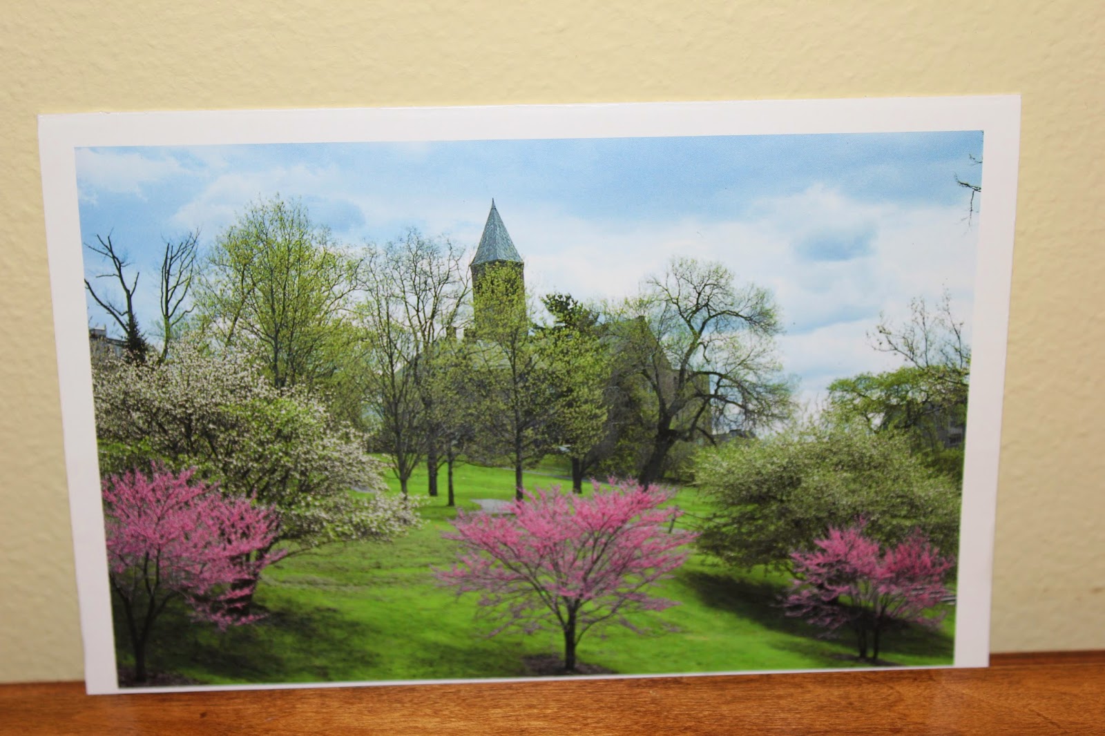 I was so surprised and happy when I opened this card to find Cornell's slope, with the clock tower in the distance, staring back at me -- What sweet memories! Even sweeter were the words of the card: