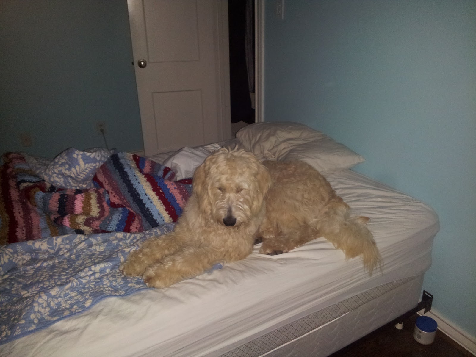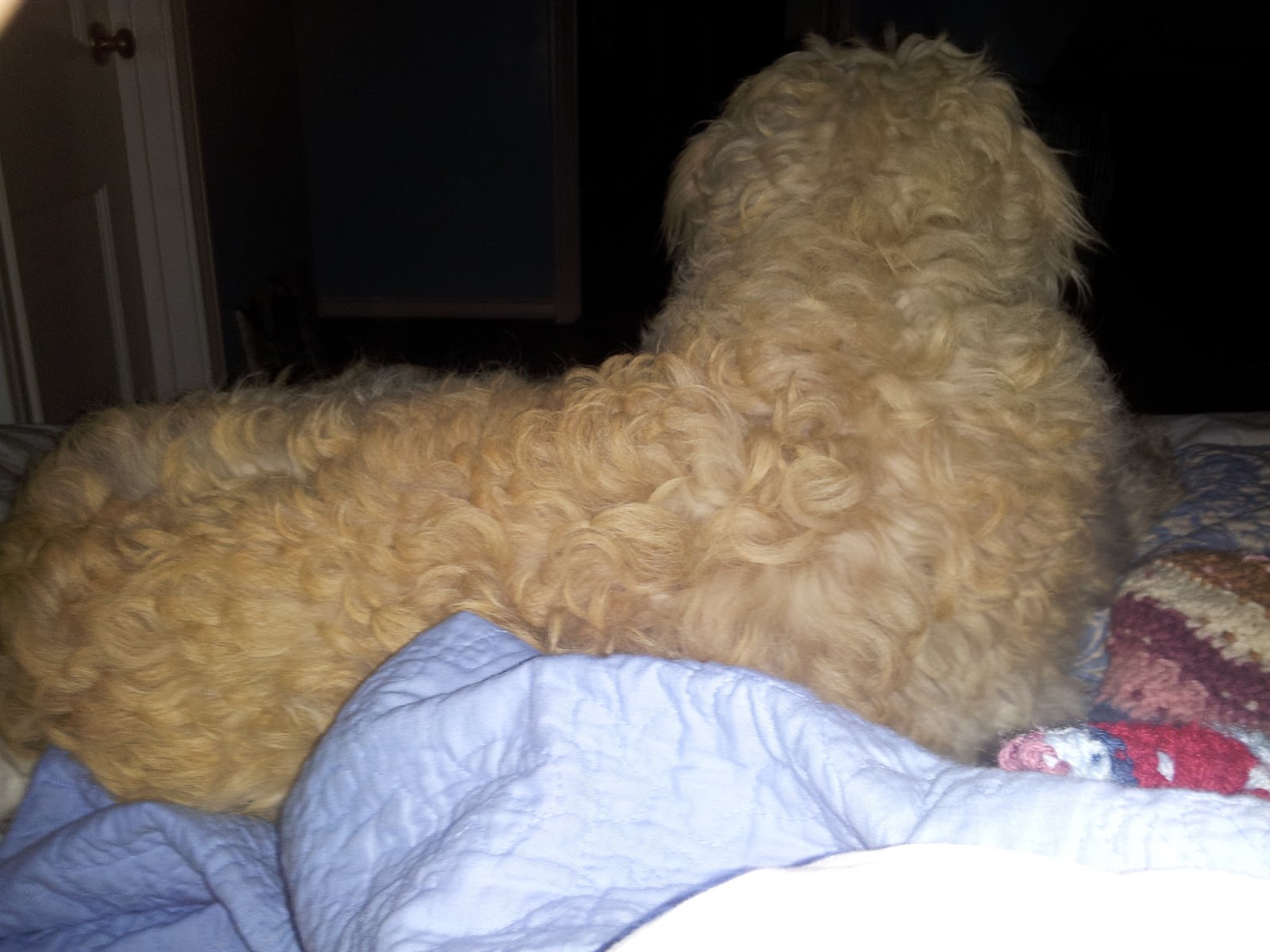 I am angling for a new rule in our household! Jeff is still staunchly opposed to having Milt in the bed, but I attempting to shift the "No Dog in the Bed" rule to "No Dog in the Bed on WEEKNIGHTS." This past Saturday night, we went out with friends to a party, and when we got home, both Jeff and I hopped into bed. I encouraged Milt to jump up on our bed, and Jeff did not throw too much opposition my way, which was a good sign. We snuggled in with Milt between us, and, let me tell you, my Jeffery was wrapped all around that Milton. Our doodle certainly is a charmer, but at 60-lbs in our double bed, he eventually hopped out because he was too warm and really couldn't find an awful lot of good space.