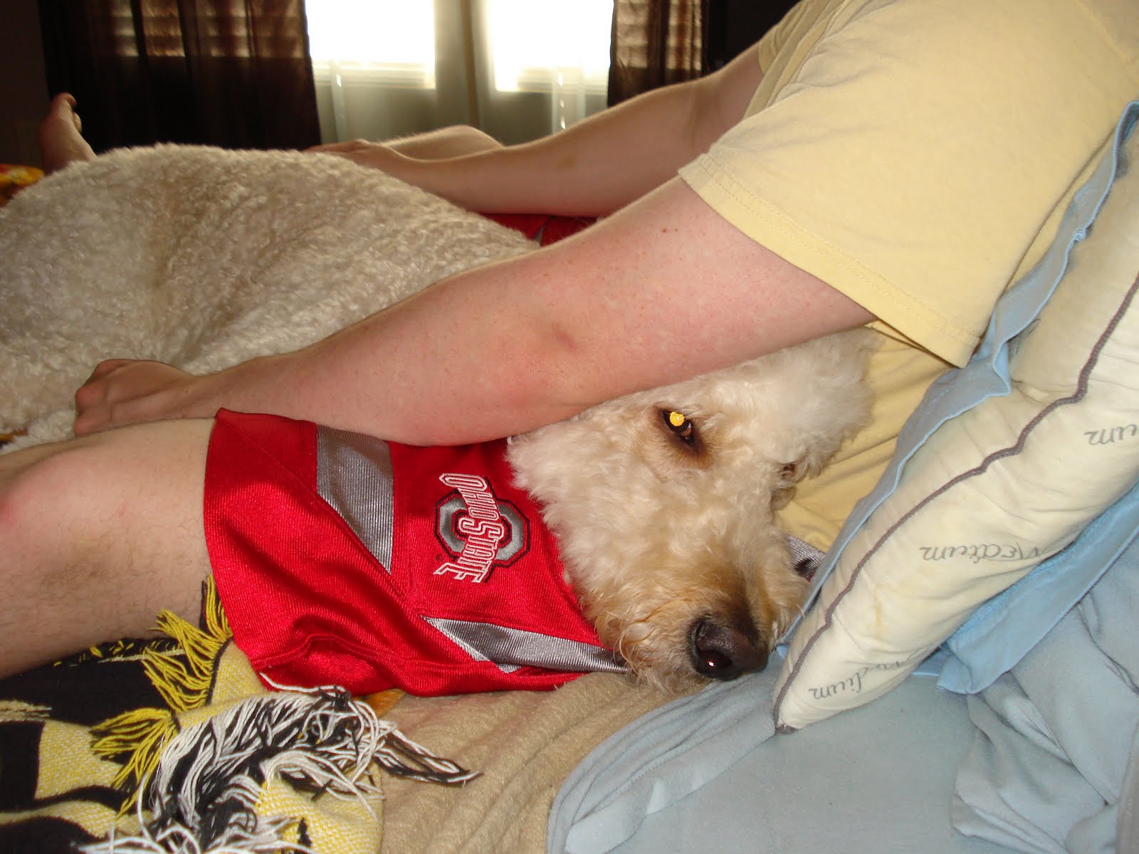 slowly but surely getting better for Remington. He had only been having like 1-2 inch poos, but this morning he had a nice normal 6 inch one. (Sorry if I gross you out with his bowel movement updates, but they are important!) We have been letting him be without his cone when he is on the bed with us, but when we are sleeping or any other time the cone stays on. He seems to enjoy the moments that he is cone free! He still is not drinking water very well except when it is poured over his food, so we started letting him drink water out of one of our cups. For some reason he seems to think this is a special water since his Mom and Dad drink their water like this. I don't care how we get him to drink as long as it works. I think if we could get more water in him it would help a lot with his bowel movements since it would hopefully flush those meds out of his system faster. He is still not wanting to walk very much, but Dan and I have been petting him and praising him when he stands and walks normally hopefully to build his confidence up some. The razor burns on his bum are finally starting to scab over. Once they do this I think it will help with the pain and the walking. He has been sleeping and eating very well, but he wants to physically lay completely on top of us most of the time as if he is seeking protection from some unknown source.