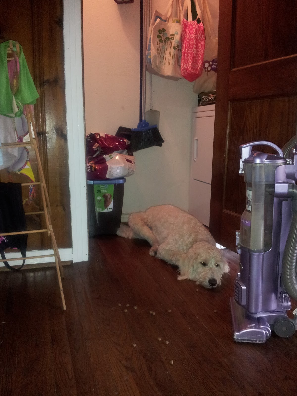 The other Saturday Monty and I left for our hospital visits in the morning and when we came back before noon, Auggie's bowl was as clean as it was when we left. My DH did not even think about feeding the poor growing boy! So yeah, I trust my DH....NOT!