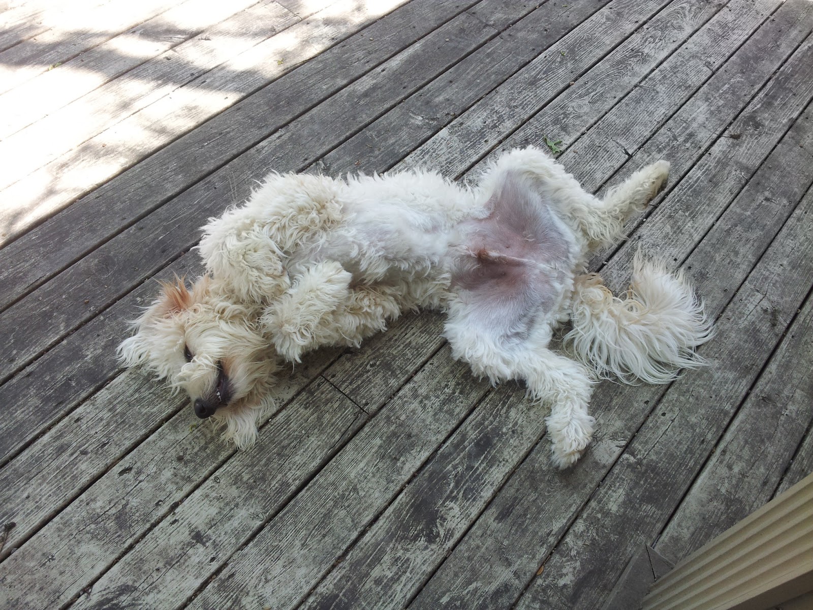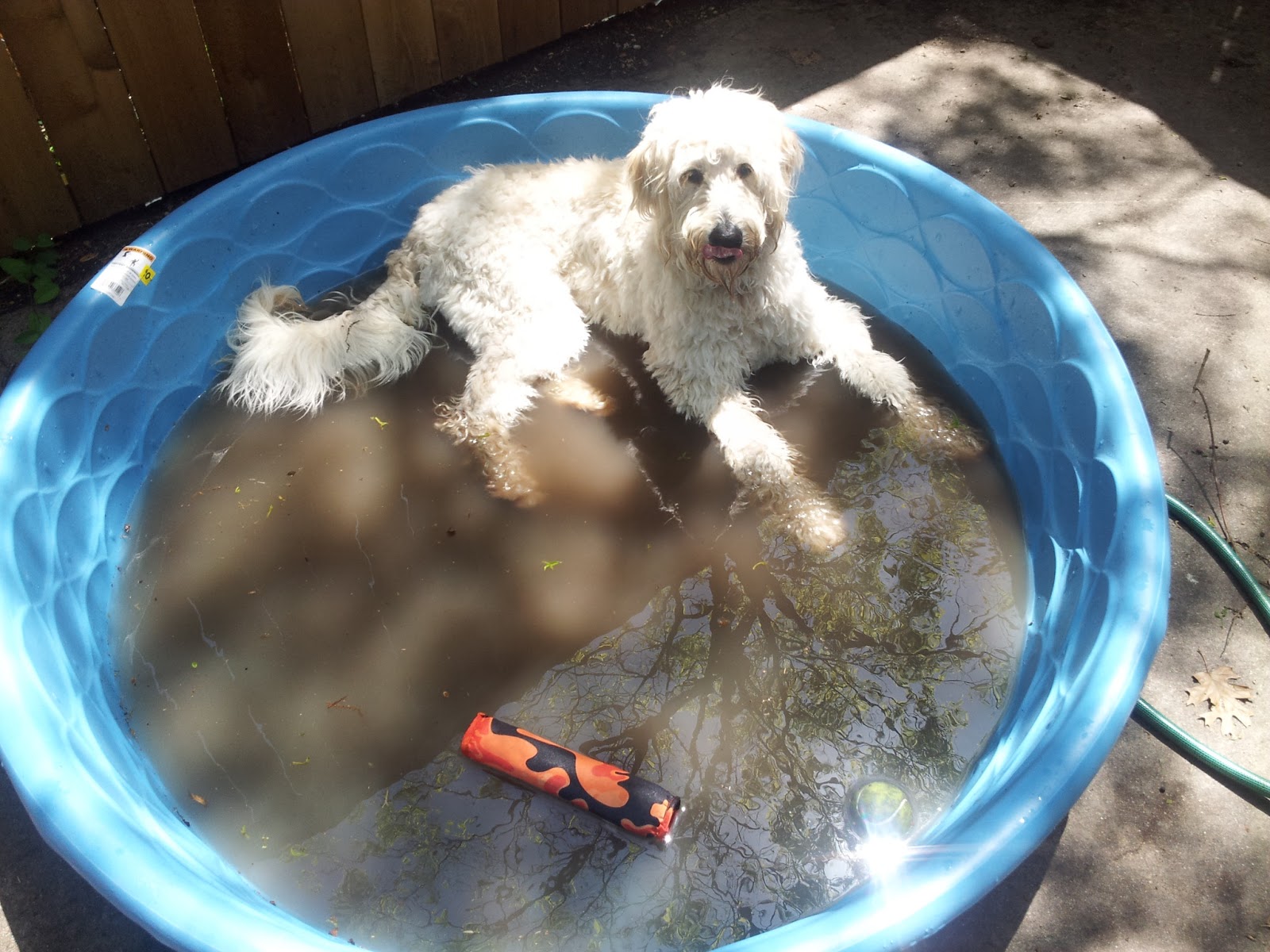 I know what you are thinking - this is sad and strangely pathetic. Well, this big blue pool fits in our yard, we can store it away when we are done with it, AND it is still large enough to fit both Milt Dog and me. Our goldendoodle feels pretty darn lucky to have his own private watering hole out back.