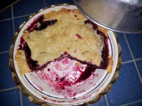 At the land, Milt had an absolute ball scampering down the trails, wading in the pond, scavenging in the underbrush, and he even barreled through the cornfield at one point -- a secret force rustling the ears as he scurried along! Mom and I were hard at work gathering loads of berries while the Milt frolicked. What do we do with our bounty? Well, we make muffins, of course, but, more importantly, we bake PIE!