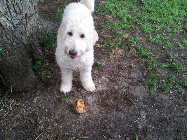 It was a meaty knuckle bone that Milton simply could not resist. I was more than a little mortified. That is certainly not how Jeff and I raised that boy. Normally, I can talk my way out of these situations fairly easily -- it looked like a free sample, Milt just took a little nibble, etc; however, in this case, Milt was squarely in the wrong with his Momma holding him red-pawed.