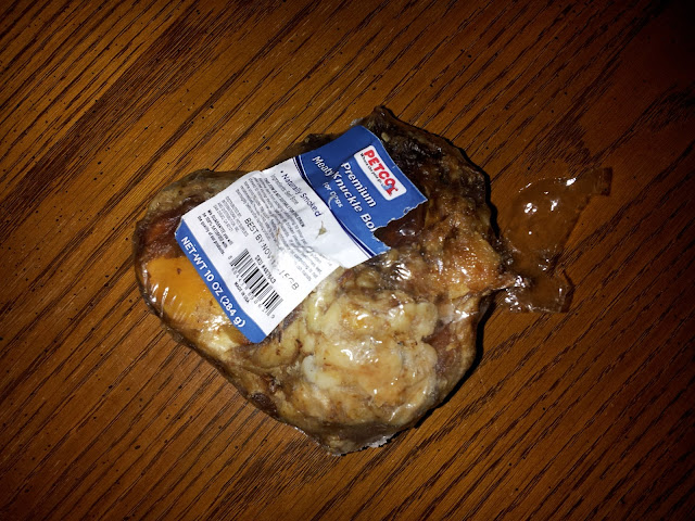 Milt Dog and I waited and waited while he yanked and tugged on his leash because, as you know, a pet store is pretty exciting for a little fellow. Foolishly, Petco placed their engraving machine directly next to a whole nicely refrigerated section of various real bone products right at puppy nose level. The next time I responded to one of Milton's yanks, I noticed he was munching on something and what do I see but this: