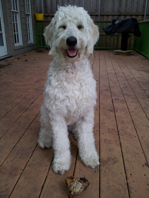 I thought about throwing out the knuckle, just to teach Milt a lesson, but we all know how quickly dogs forget things. He probably just thought his Momma bought him this bone to be sweet: Wasn't that nice of her? Well, what's the moral of this story? The Milt was just like a kid in a candy shop, and he is not to be trusted near food. Ever. Last night, he hauled himself up on a kitchen chair to reach the table. This boy is on a roaring rampage.