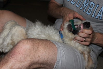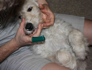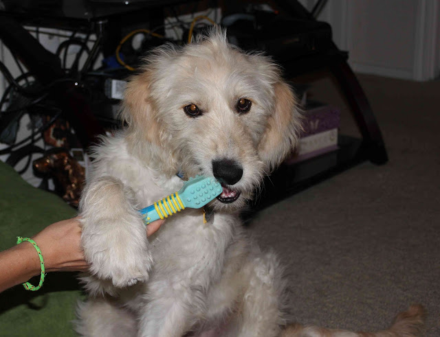 Milton did not seem particularly thrilled with the taste of the paste. It must not be real chicken... Will we start brushing Milt's teeth every night before bed? I think so. Poor teeth care can develop into a big problem and a costly clean when your dog is older. We need to keep this doodle in tip top shape and that includes his pearly whites.