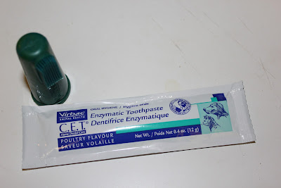 We received a free sample brush and toothpaste packet (poultry flavored!) from our vet, so we thought we would give brushing a whirl.