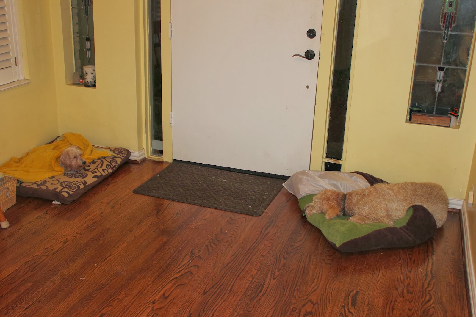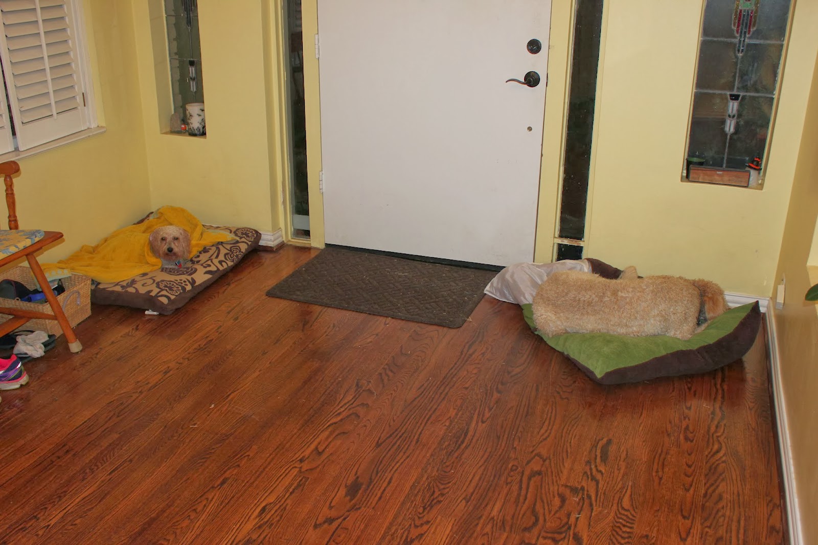 I finally figured out that Milton was not soliciting Dusty in some rowdy, wet play, but rather, he truly wanted his bed back, in a bad way, because he is the rightful owner, especially when he is soaking cold. Milton was being more than a little rude to his guest, but he did have a valid point. How was I to rectify this nasty situation? Well, Momma Dog hauled Milt's back door guard dog bed all the way up front to appease both parties.