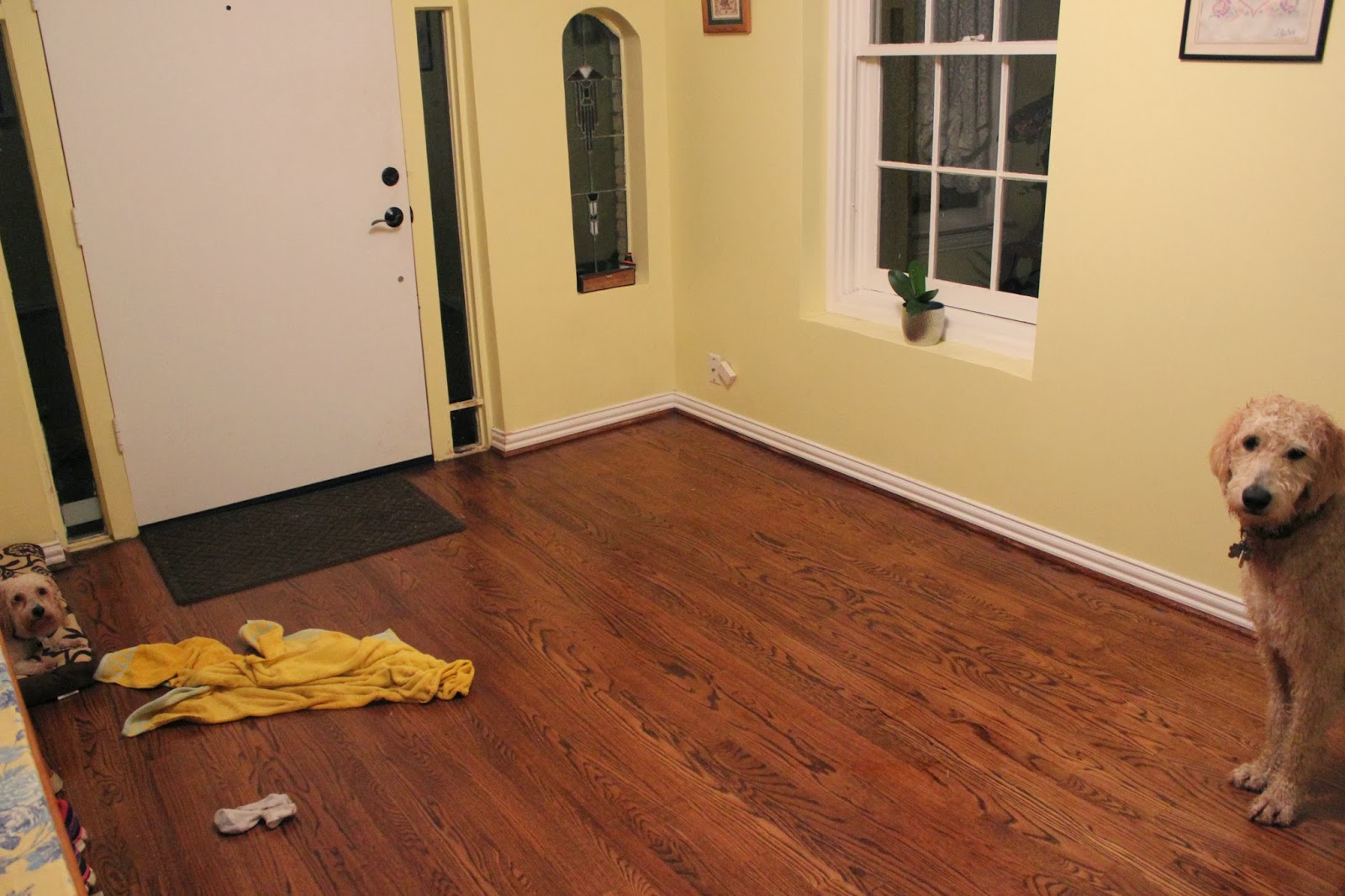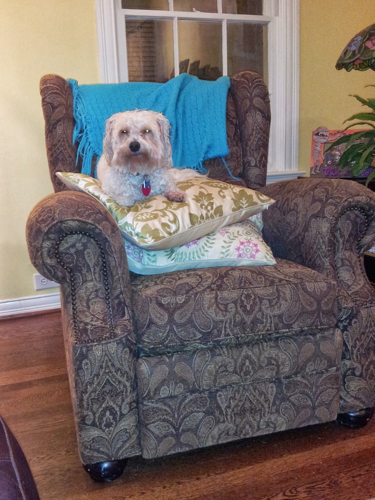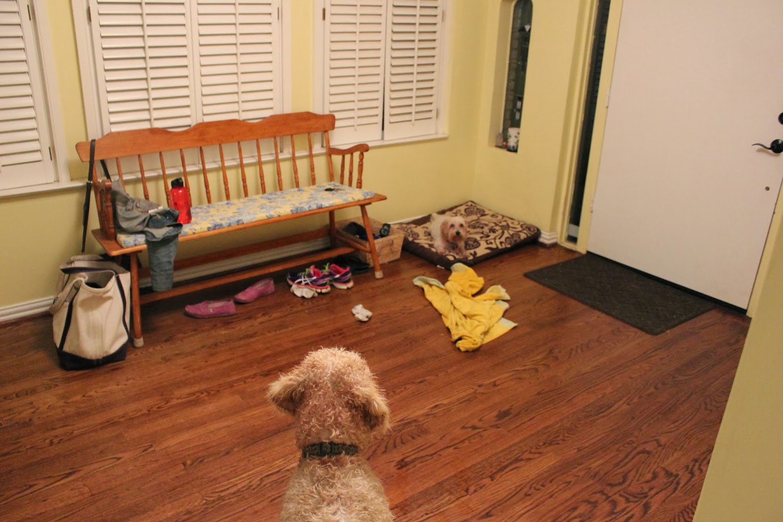 Once back in our warm, cozy home, I thought we would all cuddle up and relax for the remainder of the evening, but, sadly no, all thanks to our goldendoodle. A big problem arose when Dusty Dog set up camp on Milt Dog's bed immediately upon return. All day long, prior to his, Dusty had laid on Milton's bed, and not once did Milton bat an eye. Tonight, quite possibly due to his wet condition, Milton had enough of Dusty's selfish tendencies! Milt preceded to bark at Dusty from the doorway of the foyer, again and again and again. He was relentless. At first I thought that our boy simply wanted Dusty to get up and play, so I let it persist. When Dusty did jump up to bark at Milt and shoo him away, much spirited chasing around our coffee table ensued and a bit of nipping and snarling as well. Subsequently, Milton received a timeout in the bathroom with all the lights off.